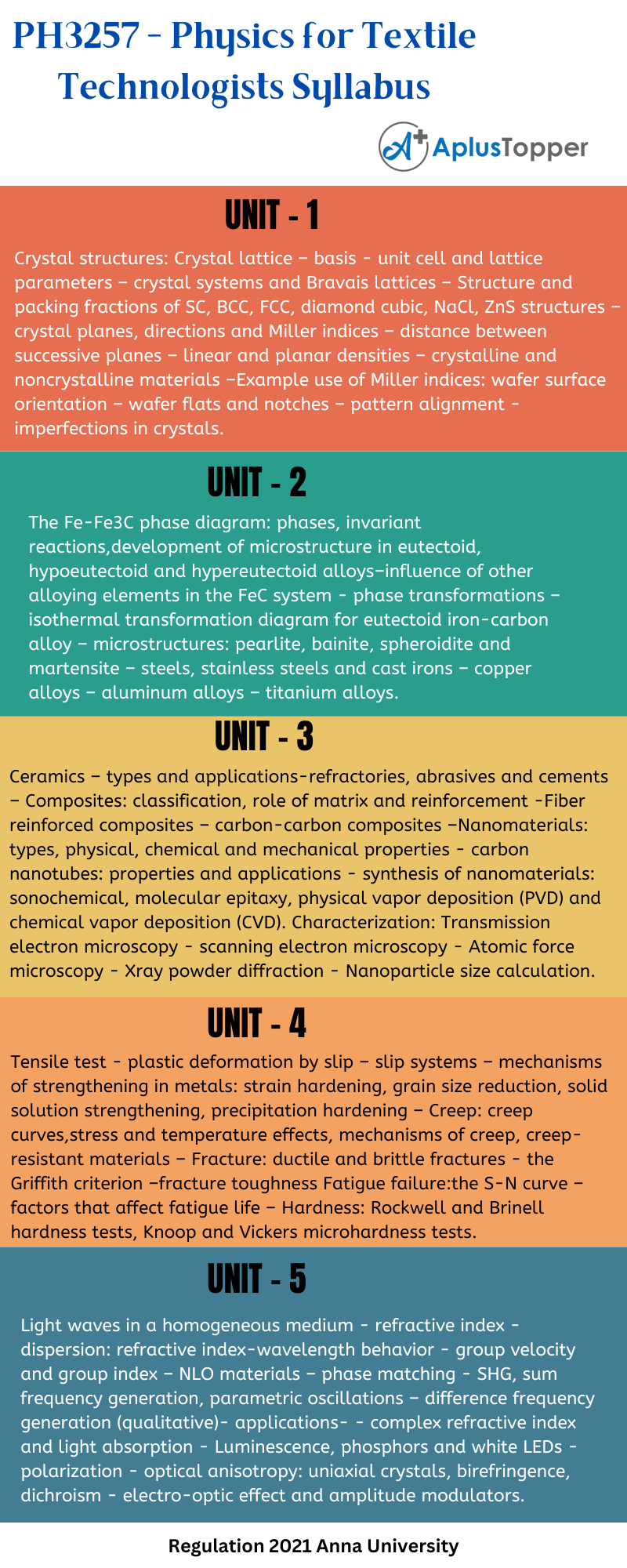 We aim to provide the following semester II PH3257 – Physics for Textile Technologists syllabus in a detailed manner. We include the appropriate syllabus textbooks and references. Hope this information is useful. Don’t forget to share with your classmates.
