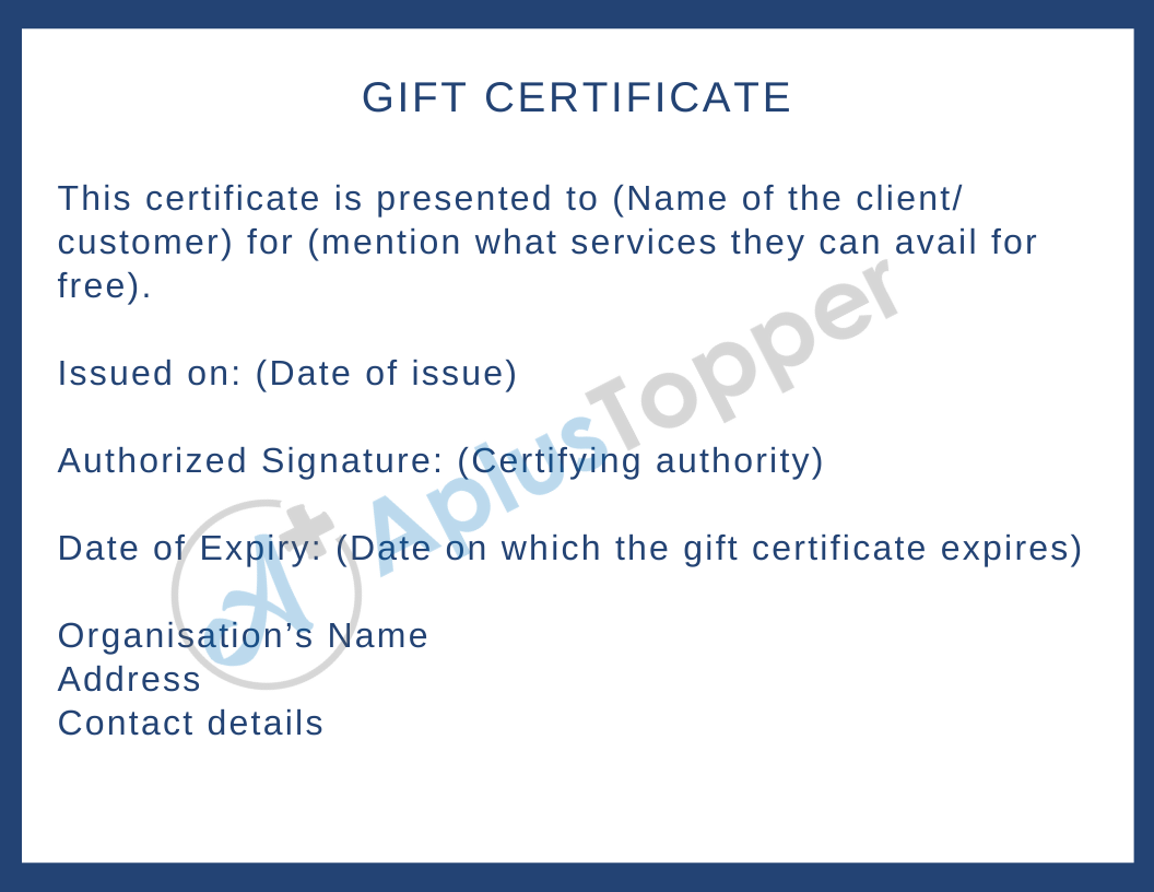 | GIFT CERTIFICATE This certificate is presented to (Name of the client/ customer) for (mention what services they can avail for free). Issued on: (Date of issue) Authorized Signature: (Certifying authority) Date of Expiry: (Date on which the gift certificate expires) Organisation’s Name Address Contact details |