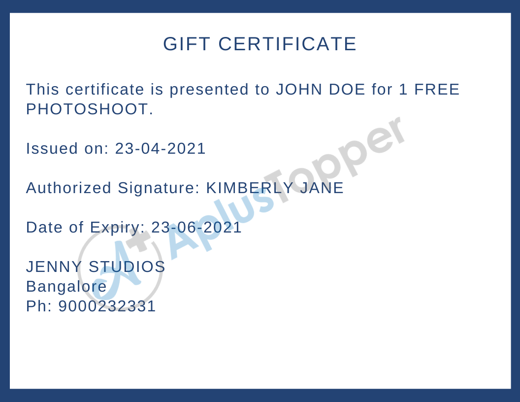 | GIFT CERTIFICATE This certificate is presented to JOHN DOE for 1 FREE PHOTOSHOOT. Issued on: 23-04-2021 Authorized Signature: KIMBERLY JANE Date of Expiry: 23-06-2021 JENNY STUDIOS Bangalore Ph: 9000232331 |