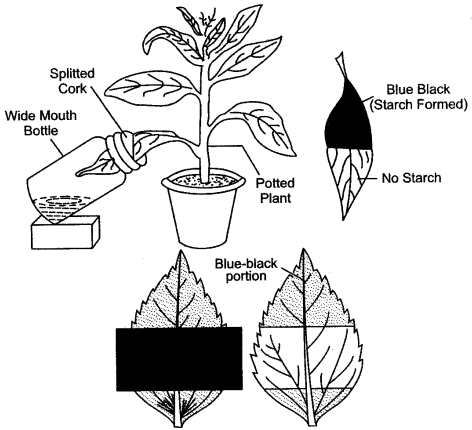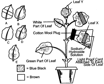 Question 25: A candidate in order to study the importance of certain factors in photosynthesis took a potted plant and kept it in the dark for over 24 hours. Then in the early hours of the morning she covered one of the leaves with black paper in the centre only. She placed the potted plant in the sunlight for a few hours, and then tested the leaf which was covered with black paper for starch.