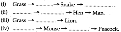 Answer: (i) Grasshopper, Hawk (ii) Grass, Insects, (iii) Rabbit, (iv) Com, Snake.