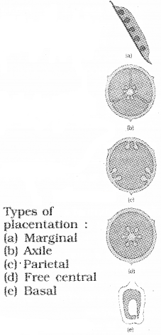 | Marginal placentation: the placenta forms a ridge along the ventral suture of the ovary and the ovules are borne on this ridge eg- pea. Axile placentation: When the placenta is axial and the ovules are attached to it in a multilocular ovary eg china rose, tomato and lemon. Parietal placentation: Ovary is one-chambered and the ovules develop on the inner wall of the ovary e.g., mustard and Argemone. Free central placentation: When the ovules are borne on central axis and septa are absent Eg Dianthus and Primrose Basal placentation: The placenta develops at the base of ovary and a single ovule is attached to it eg sunflower, marigold |
