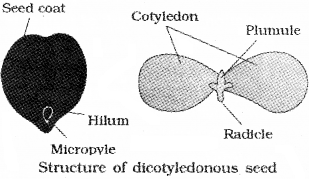 The seed coat has two layers, the outer testa and the inner tegmen. The hilum is a scar on the seed coat .Above the hilum is a small pore called the micropyle. It consists of an embryonal axis and two cotyledons. The cotyledons are fleshy and contains reserve food materials. At the two ends of the embryonal axis are present the radicle and the plumule.