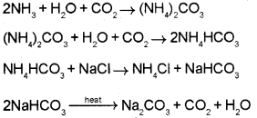 b) In Solvay process, sodium carbonate is prepared by passing CO2 to a concentrated solution of sodium chloride saturated with ammonia to form ammonium hydrogen carbonate. This reacts with sodium chloride to form ammonium chloride and sodium bicarbonate. Sodium bicarbonate on heating gives sodium carbonate.