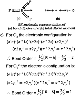 b) Dipole moment is defined as the product of the magnitude of the charge and the distance between the centres of positive and negative charge. Mathematically, Dipole moment (μ) = Charge (Q) x Distance of separation (r) BF3 has a symmetric trigonal plannar geometry in which the B-F bonds are oriented at an angle of 120° to one another. The three bond moments give a net sum of zero as the resultant of any two is equal and opposite to the third.