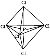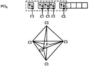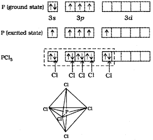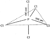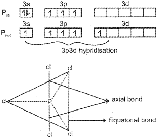 In PCI5 the five sp3d orbitals of phosphorus overlap with the singly occupied p orbitals of chlorine at-oms to form five P-CI sigma bonds. Three P-CI bond lie in one plane and make an angle of 120° with each other; these bonds are termed as equatorial bonds. The remaining two P-CI bonds-one lying above and the other lying below the equatorial plane, make an angle of 90° with the plane. These bonds are called axial bonds. As the axial bond pairs suffer more repulsive interaction from the equatorial bond pairs, therefore axial bonds have been found to be slightly longer and hence slightly weaker than the equatorial bonds; which makes PCl5 molecule more reactive.