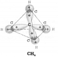 ii) In CH4 molecule there is mixing of one s-or- bital and three p-orbitals of the valence shell to form four sp3 hybrid orbitals of equivalent energies and shape. There is 25% s-character and 75% p=character in each sp3 hybrid orbital. The four sp3 hybrid orbitais so formed are directed towards the four corners of the tetrahedron. The angle between sp3 hybrid or bita.