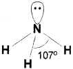 b) In ammonia there are four electron pairs around the central atom nitrogen of which three are bond pairs and one is a lone pair. The three bond pair orbitals form sigma bonds with three hydrogen atoms. The lone pair is present on nitrogen atom. A tetrahedral shape is expected but due to Ip-bp repulsion which is more than bp-bp repulsion the angle between bond pairs is reduced to 107° from 109.5° and the molecule assumes a trigonal pyramidal shape.