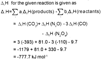 The enthalpy of formation of CO(g), CO2 (g), N2O (g), N2O4 (g) are -110, – 393, 81 and 9.7 kJ mol-1 respectively. Find the value of ∆rH for the reaction: