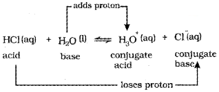 HCl(aq) acts as an acid by donating a proton to H2O molecule which acts as a base because it accepts the proton. The species H2O+ is produced when water accepts a proton from HCl. Therefore, Cl– is the conjugate base of HCl and HCl is the conjugate acid of Cl–. Similarly, H2O is the conjugate base of H2O+ and H3O++ is the conjugate acid of the base H2O.