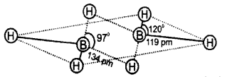 In boron atom lies one plane. Above and below this plane, there are 2 bridging H- atom. Each bridged H atom is bonded to 2 boron atom only by sharing of 2 electrons. Such a bond is called 3 centered 2 electron bond. Thus diborane have two (B-H-B) bonds, ie., two 3-centered 2 electron bond and four (B-H) bonds, ie., four 2 centered 2 electron bond.