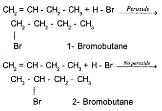 Predict the products formed by addition reaction of HBr to but -1- ene in the presence of peroxide and in the absence of peroxide.