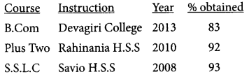 | S.S.L.C. | St. Mary’s H.S.S. Irinjalakuda | 2010 | 80 |