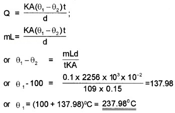 A brass boiler has a base area of 0.15m2 and thickness 1.0cm. It boils water at a rate of 6.0 kg/min when placed on a gas stove. Estimate the temperature of the part of the flame in contact with the boiler. Thermal conductivity of brass = 109 J s-1 m-1K-1;