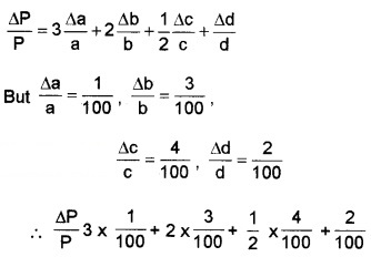 A physical quantity P = \(\frac{\sqrt{a b c^{2}}}{d^{3}}\) measuring a, b, c and d separately with the percentage error of 2% , 3%, 2% and 1% respectively. Minimum amount of error is contributed by the measurement of