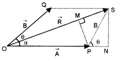 The resultant vector \(\overrightarrow{\mathrm{R}}\) make an angle a with \overrightarrow{\mathrm{A}}. From the right angled triangle OSN,