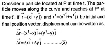 Consider the motion of an object in a plane. Let P be the position of a moving object at a time t and p1 that at a later time t1. \(\overrightarrow{\mathrm{OP}}\) and \(\overrightarrow{\mathrm{OP}^{1}}\) are the position vectors at time t and t1 respectively. So the vector \(\overrightarrow{\mathrm{PP}^{1}}\) is called displacement vector corresponding to the motion in the time interval (t – t1).