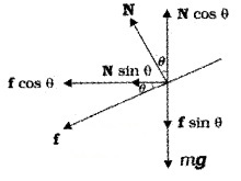 The vertical component can be divided into N Cos q (vertical component) and N sin q (horizontal component). Suppose the vehicle has a tendency to slip outward. Then the frictional force will be developed along the plane of the road as shown in the figure. The frictional force can be divided into two components. F cos q (horizontal component) and F sin q (vertical component).