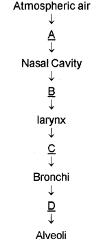 Nostrils → nasal cavity → nasopharynx → larynx alveoli ← branchioles ← bronchi ← Trachea.