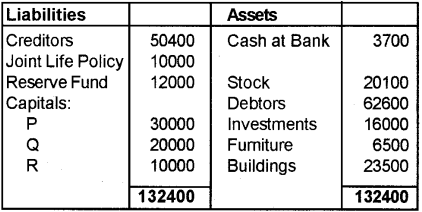 The Balance sheet of P, Q and R sharing profit and losses in the ratio 3:2:1 respectively. The balance sheet on 30th June 2010 was as follows: (March 2013)