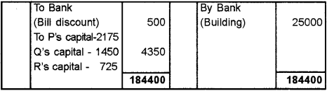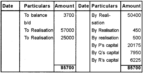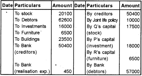 The firm was dissolved on that date. For the purpose of dissolution, the investments were valued at Rs. 18000 and Stock at Rs. 17500. ‘P’ took over investments and ‘Q’ to take over stock. ‘R’ took over furniture at book value. Debtors and buildings realised Rs. 57000 and Rs. 25000 respectively. Expenses of realisation amounted to Rs. 450. In addition one bill forRs. 500 under discount was dishonored and had to be taken up by the firm. Prepare Realisation A/c, Partners Capital a/c and Bank A/c.