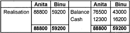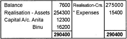 Anita – Rs. 76,500 and Binu Rs. 43,000. The creditors amounted to Rs. 2,75,000. The balance of cash was Rs. 7,600. The assets realised Rs. 2,54,300, the expenses of realisation were Rs. 15,400. Anita and Binu were solvent. Close the books of the firm, showing the realisation account, capital accounts and cash account.