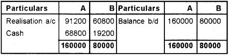 A and B were partners in a firm sharing profits and losses in the ratio of 3:2 respectively. They decided to dissolve the firm on 31st March, 2010. On that date, their capitals stood at Rs. 1,60,000 and Rs. 80.0 respectively. Amount owned by “B” to firm was Rs. 59,200 and there was a loan by “A” for Rs. 72,000. Creditors were Rs. 4,80,000, sundry, assets Rs. 6,89,600 and cash Rs. 43,200. Sundry assets realised Rs. 5,53,600. Realisation expenses amounted to Rs. 16,000. (March 2013)