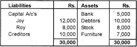 Joy and Roy were in partnership, sharing profits and losses equally. Their Balance Sheet as on 31-03-2012 was as follows : (May 2013 (Say)
