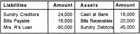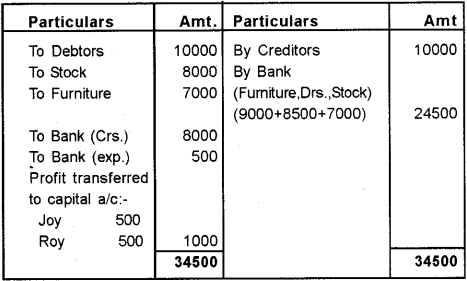Furniture Rs. 8000 Debtors Rs. 6,500 Stock Rs. 5,000 Creditors were paid in full.