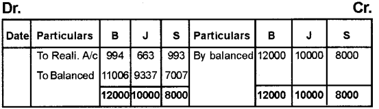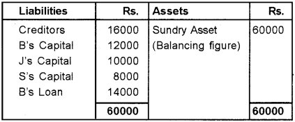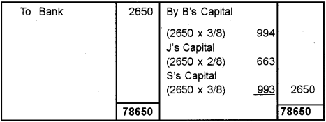 B, J & S are partners in a firm sharing profits and loses in the ratio of 3:2:3. They have decided to dissolve the firm. On the date of dissolution total creditors were Rs. 16,000 Bills discounted Rs. 2,650 during the year has become a real liability which has not paid, though this has not been recorded anywhere in the books of accounts. The capital account balances were: B Rs. 12,000, J Rs. 10,000, S Rs. 8,000. B advanced 14,000 besides his capital account. (Say 2011)