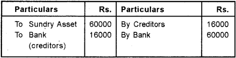 When a creditor accepts an asset which has a higher value than the amount due to him, then an entry will be passed only for receiving the excess amount from such creditor. Here, fixture taken over by creditor for Rs.60000, which is higher than the amount due to him ie. 50000. The excess amount Rs.10000/- (60000 – 50000) is credited to Realisation a/c.