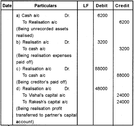 d) Profit on Realisation Rs.48000 to be distributed between partners Vishal and Rakesh.