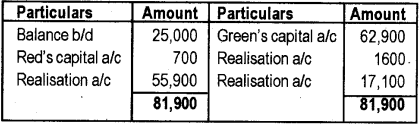 Green took over plant and machinery at an agreed value of Rs. 60,000. Stock and furniture were sold for Rs. 42,000 and Rs.13,900 respectively. Debtors were taken over by Red at Rs.69,000. Creditors were paid at a discount of Rs.900. Green agreed to pay the loans. Realisation expenses were Rs.1,600. Prepare necessary Ledger A/cs.