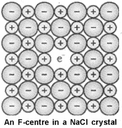 ii) It is caused by metal excess defect due to anion vacancies. When crystals of NaCI are heated in a atmosphere of sodium vapour, the sodium atoms are deposited on the surface of the crystal. The Cl- ions diffuse to the surface of the crystal and combine with Na atoms to give NaCI. The electrons released from Na atoms diffuse into the crystal and occupy anionic sites to form Fcentres, which impart yellow colourto the crystal. The colour results by excitation of these electrons when they absorb energy from the visible light falling on the crystals.