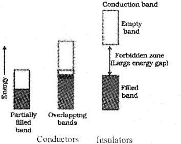 c) In conductors the valence band is either partially filled or it is overlaped with a higher energy unoccupied conduction band so that the electrons can flow easily under an applied electric field. Whereas in insulators the energy gap between the filled valence band and the next higher unoccupied conduction band is large so that electrons cannot jump to it.