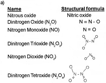 a) Nitrogen forms a number of oxides in the different oxidation stats. Write the names and structural formulae of any four oxides of nitrogen. (March – 2013)