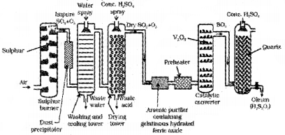 iii) Preparation of oleum by absorbing sulphur trioxide in sulphuric acid. It is diluted with enough water to get sulphuric acid of desired concentration.