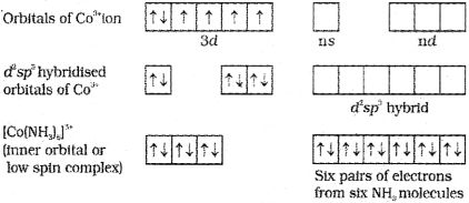 In the complex, [Co(NH3)6]3+ the cobalt ion is in +3 oxidation state and has the electronic configuration 3a6. It undergoes d2sp3 hybridisation as shown below:
