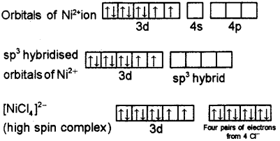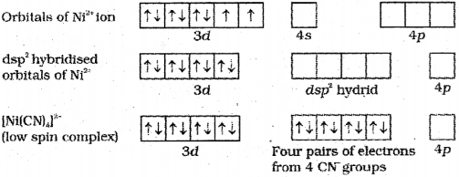 a) In the complex ion [Ni(CN)4]2 the central metal atom Ni is in +2 oxidation state and has the electronic configuration 3d8. Since CN – is a strong field ligand two unpaired electrons are forced to pair up against Hund’s rule and makes available a vacant 3d, one 4s and two 4p orbitals, which hybridise to give four dsp2 hybrid orbitals. Each of the hybrid orbitals receives a pair of electrons from a cyanide ion to form [Ni(CN)4]2-. Since there is no unpaired electron, the complexion is diamagnetic.