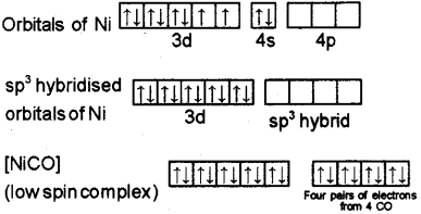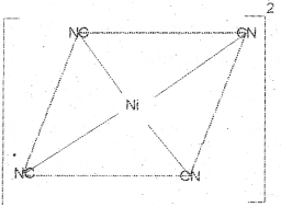 b) i) In [Ni(CO)4] the central atom Ni undergoes sp3 hybridisation. Hence, it has a tetrahedral geometry. In [CoF6]3 the central metal ion Co3+ is in the sp3d2 hybridised state. Hence, it has an octahedral geometry,