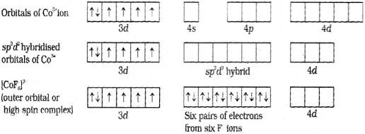 In [CoF6]3- also he cobalt ion is in +3 oxidation state and has the electronic configuration 3d6. Since F ion provides a weak ligand field one 4s, three 4p and two 4d orbitaIs hybridise to yield six sp3d2 hybrid or bitaIs pointing towards the six ends of an octahedron. The six Fions then donate a pair of electrons to each of these vacant orbitals to have an octahedral geometry. The presence of unpaired electrons in 3d orbit ais makes the complex paramagnetic.