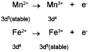 The electronic configuration of Mn2+ is 3d5 , which is stable due to half-filled sub-shell. Hence, Mn2+ is not easily oxidised to Mn3+. On the other hand, Fe2+ has electronic configuration 3d6 . After losing one electron it changes to Fe3+ which has stable 3d5 electronic configuration. Hence, Fe2+ is relatively easily oxidised to Fe3+