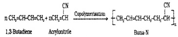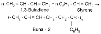 Polymerisation reaction in which a mixture of more than one monomeric species is allowed to polymerise and form copolymer, e.g. Buna – S. It is quite tough and is a good substitute for natural rubber. Uses: for the manufacture of automobile tyres, floortiles, foorwear components, cable insulation, etc.