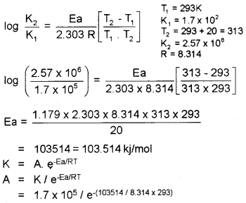 The rate constant of a reaction at 293 K is 1.7 × 105 s-1. When the temperature is increased by 20K, the rate constant is increased to 2.57 × 106 s-1. Calculate Ea and A of the reaction.