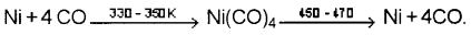 Ni is strongly heated at a temperature of 330 – 350K to form nickel tetra carbonyl. It is again heated strongly 450 – 470 to decompose it.