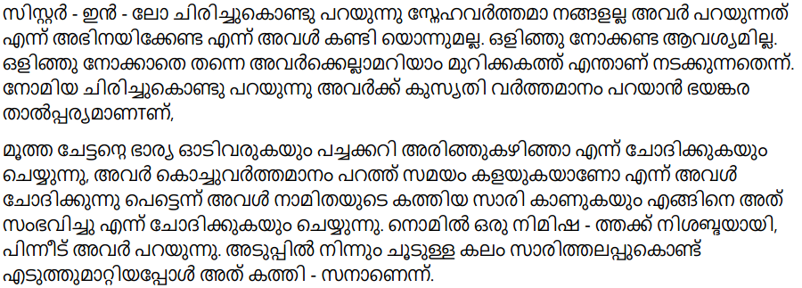 Nomita was about to say something. But her niece Rini steps into the room. Rini asks her how long the washer-man should wait. If Nomita does not want to give him any clothes, tell him. Fora moment Nomita does not say anything. Then she picks up the dirty clothes and sorts them. She asks Rini to go down and tell the washer¬man to wait for her.
