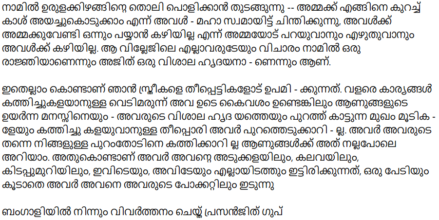 Page 20: He asks her how could her mother go on begging for money from him and still think they are high-class people. How can a dung-picker’s daughter be a queen? Nomita asks him to shut up. She spoke so loudly that everybody nearby would hear her if she was speaking from the ground floor. But they were on the 3rd floor. Ajit says he won’t shut up and will do what he wants. What can she do about it? She says she can do something. She now does something quite astonishing. She picks up a matchbox lying near and lights a matchstick and touches it to her sari. The sari flares up. Asking if she has gone mad, Ajit comes rushing and puts out the fire using his hands. Now he is a little afraid. He looks at her and he sees fire burning, blazing on her face. He can’t easily put out that fire. He tells her that she loses all common sense when she is angry. How could a woman be so angry!