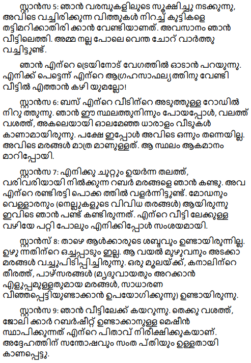 Stanza 7: All around me I see rows of rubber plants on the ridge. They have grown twice my height. I used to see modan and vellaran (varieties of paddy) here. I am confused even about the path leading to my home.