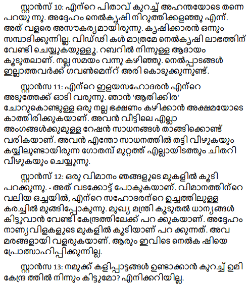 Stanza 1: After four years of research in North India, I return home. I have received a doctoral degree. I also received a lot of praise for my work on making toys with husk. I am bored with eating chapatti every day and now I want to eat a meal of athikira rice (a variety of rice popular in central Kerala).