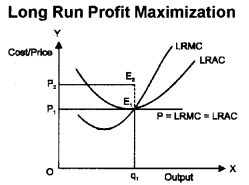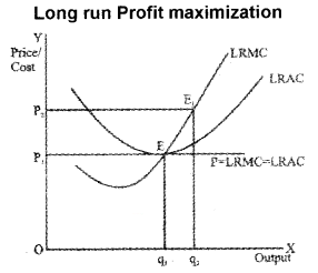 The profit maximization level of the firm is reached when the long run supply curve of the firm is that portion of LRMC curve which lies over and above the minimum point of LRAC curve (P>minimum of LRAC). The supply curve of a firm, in the long run, is the rising portion of minimum point of LMRC. It can be explained with the help of the following figure.